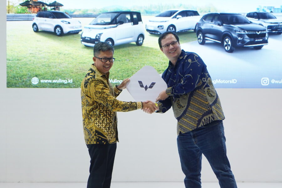 Penandatanganan simbolis MoU yang dilakukan oleh Vice President Wuling Motors, Arif Pramadana dan Managing Director DHL Supply Chain Indonesia, Matthias Gehrsitz.
